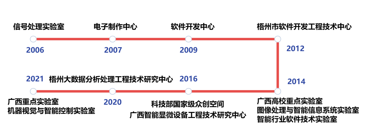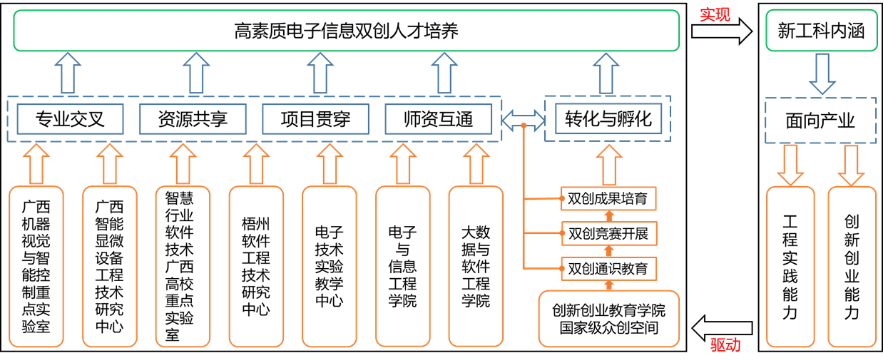 (一)成果简介 电子信息专业群是梧州学院支柱专业群,在成规模培养专业人才的同时,探索形成了在新工科建设背景下以“党建引领,平台协同,项目牵引”高素质电子信息双创人才培养的新模式,为落后地区地方性新建本科院校在资源短缺的背景下培养高素质拔尖人才提供了样板。 1.党建引领:一保障三引领 党建保障平台建设和发展。从科研平台初创时的艰苦创业,到现在电子信息科研平台集群发展,早年的系党总支书记,近年电子信息工程学院三任党委书记都是科研平台建设的主要组织者,学校党委常委、副校长玉振明教授是电子信息学科的创建者和领军人,学校两级党组织的主导作用,有力保障了平台建设和发展。一是以党建引领导师团队建设,通过典型引领、先锋示范,建成“红色导师”团队。二是以党建引领平台协同,二级学院党委紧扣双创人才培养目标,协调配置好分布在不同二级学院的国家众级创空间、自治区重点实验室和自治区工程中心等平台资源,协同开展高素质人才培养。三是以党建引领学生团队建设,将党建和思政元素融入学生团队,厚植人才成长沃土,极大促进了学风建设,形成显性和隐性教育并存的“红色”浸染氛围。